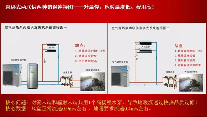 首先,空氣源高效兩聯(lián)供和低效兩聯(lián)供的主要區(qū)別是什么?經(jīng)差異化實(shí)驗(yàn)對(duì)比,主要區(qū)別在于地暖末端結(jié)構(gòu)和連接方式。因?yàn)榇蠹乙睬宄托陕?lián)供就是空氣源熱泵水機(jī)+直供式地暖,所以容易出現(xiàn)問(wèn)題的地方就是配置的地暖末端系統(tǒng)!